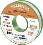 Drut do lutowania miękkiego Stannol Kristall 611 ze stopu Flowtin TSC305 o zawartości topnika 2,5% o średnicy 0,7 mm na szpuli 100g Cyna lutownicza bezołowiowa Stannol Kristall 611 Fairtin bezołowiowa Sn96,5Ag3Cu0,5 REM1 100 g 0.7 mm