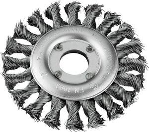 - Szczotka tarczowa, drut stalowy HSS, pleciona, do odrdzewiania, usuwania powłok, farby, silnej ochrony przed rdzą i podwozia, odkamieniania, gratowania i czyszczenia szwów spawalniczych, do metalu i kamienia, do obróbki wąskich krawędzi, ram i krat.