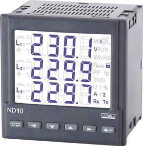 Wielofunkcyjny miernik do pomiaru parametrów prądu przemiennego trójfazowego. Napięcie zasilania jest pobierane z napięć pomiarowych L3-N.Programowalny cyfrowy miernik panelowy ND10 przeznaczony jest do pomiaru parametrów symetrycznych i niezbalansowanych trójfazowych systemów czteroprzewodowych z jednoczesnym wyświetlaniem zmierzonych wielkości i cyfrowym przekazywaniem ich wartości. Licznik umożliwia kontrolę i optymalizację urządzeń elektrycznych, systemów przemysłowych i sprzętu.Umożliwia pomiar: napięcia i prądu rms, mocy czynnej, pozornej i biernej, energii efektywnej i pozornej, współczynników mocy, częstotliwości oraz średniej mocy 15, 30 i 60 minut i THD. Ponadto wektory prądów fazowych są wykorzystywane do obliczenia wartości skutecznej prądu w przewodzie neutralnym. Wartości napięcia i prądu są mnożone przez ustawione wartości napięcia i prądu przetworników. Wskaźniki mocy i energii uwzględniają zaprogramowane wartości translacji. Wartość każdej mierzonej zmiennej może być przesłana do systemu głównego za pośrednictwem interfejsu RS-485. Wyjścia przekaźnikowe sygnalizują przekroczenie wybranych mierzonych zmiennych. Wyjście impulsowe jest przeznaczone do kontroli zużycia trójfazowej energii czynnej. Miernik wyposażony jest w wykrywanie i sygnalizację nieprawidłowej kolejności faz.